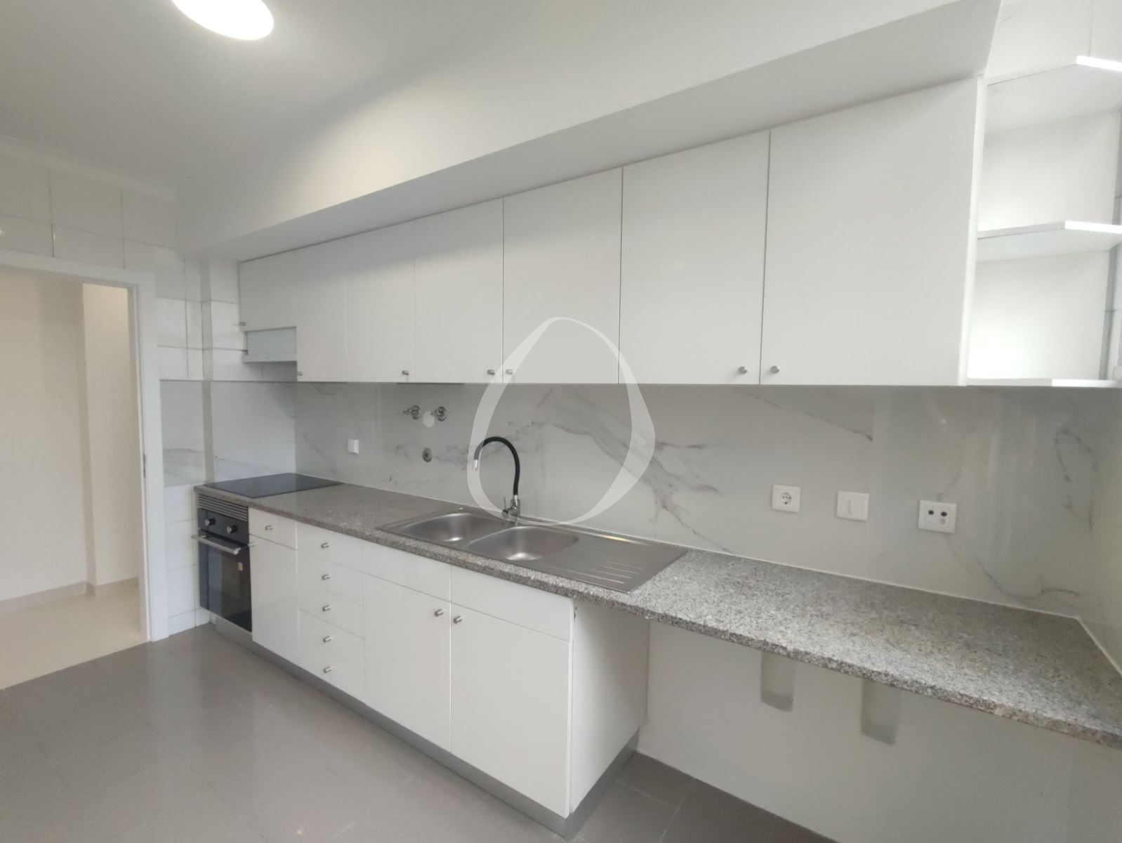 A cozinha está equipada com placa, forno e exaustor.